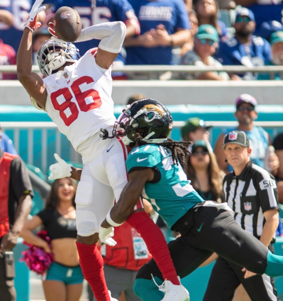 New York had a scare in the final seconds when Christian Kirk caught a Trevor Lawrence pass inside the 1-yard line with seconds left on the clock, but Fabian Moreau and other defenders prevented him from scoring what would have given Jacksonville the lead with a score and an extra point. Kirk was stopped inside the 1-yard line, and the Giants held on for the win since Jacksonville had no time left on the clock.