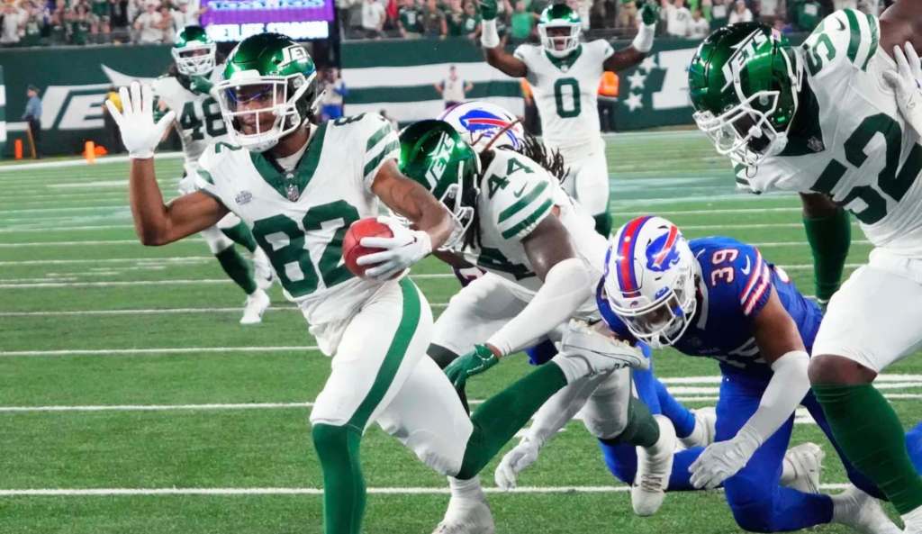 The New York Jets, even as their prized, four-time MVP offseason acquisition in Aaron Rodgers was knocked out of the game on the team’s first offensive series, unseated the Buffalo Bills on Monday night in a come-from-behind victory, 22-16.