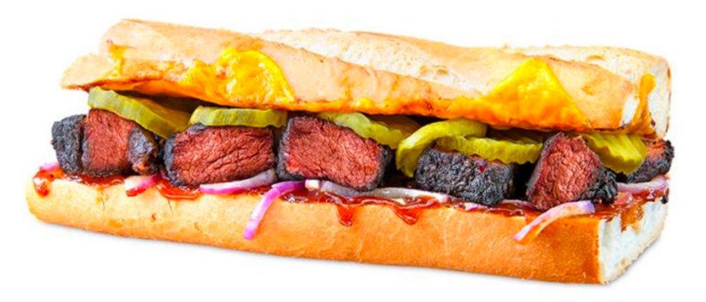 The Hickory Smoked Burnt Ends sandwich features carefully selected prime rib cuts smoked with hickory wood chips that offer a tender, juicy and flavorful bite with crispy bark, plus pickles, red onions, melted cheddar cheese, and Blue Ribbon BBQ sauce on a choice of bread, including Italian White, Whole Wheat, Jalapeno Cheddar, and Rosemary Parmesan.