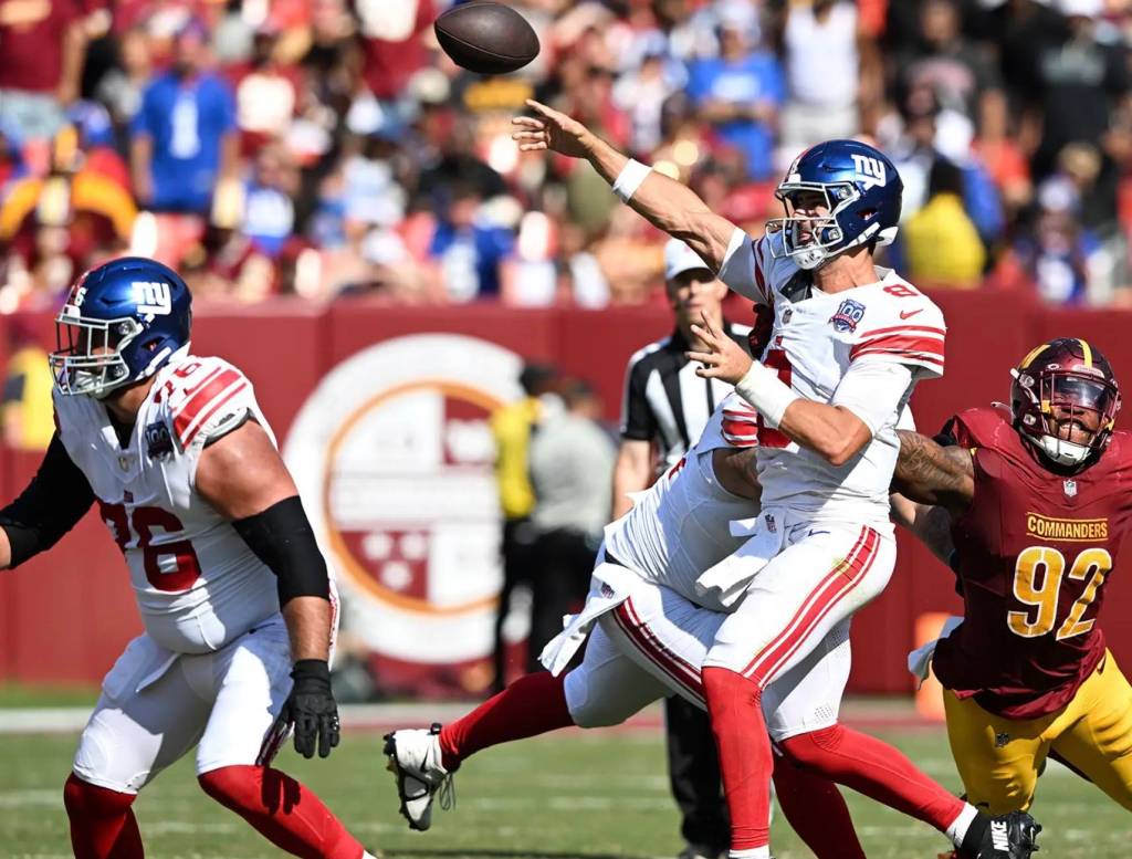 The Commanders (1-1) came back to win an ugly game after the Giants lost kicker Graham Gano to an injury on the opening kickoff. Not having Gano forced New York (0-2) to go for it on several fourth-down situations after punter Jamie Gillan missed an extra point attempt early.