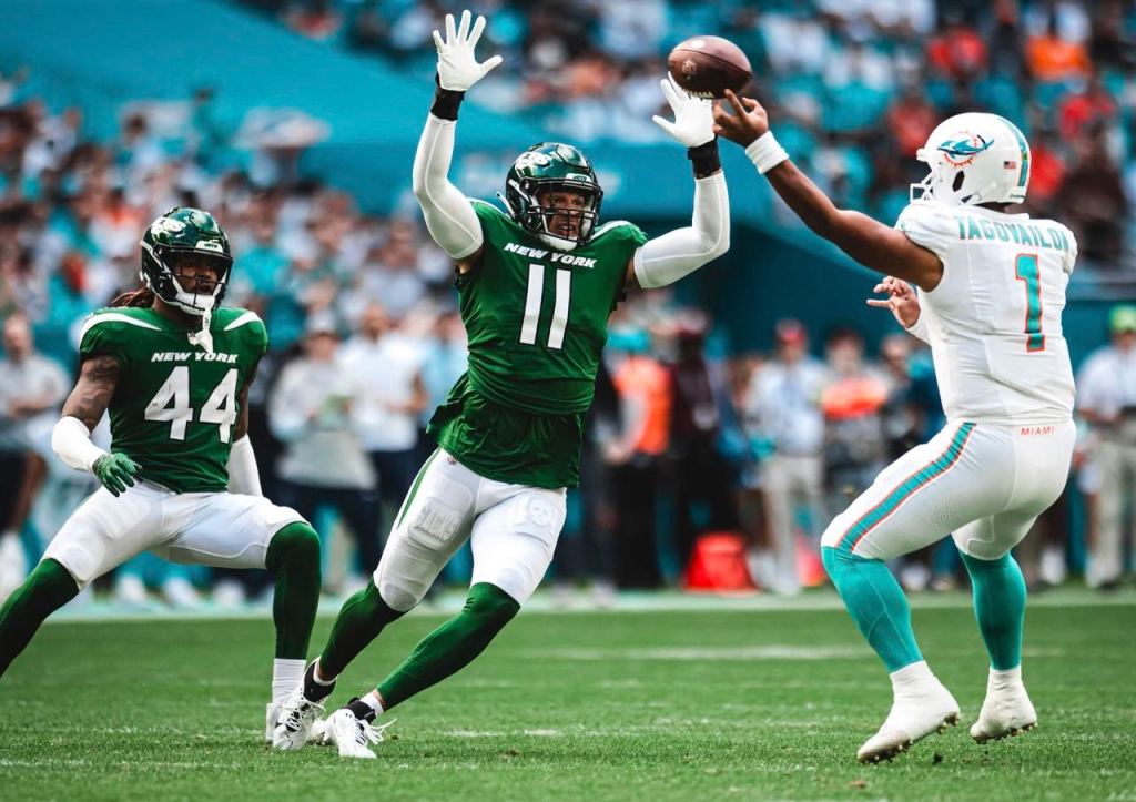 Quarterback Zach Wilson was under siege in the first half behind an offensive line that played an atrocious game. He exited the game just before halftime with a head injury. Wilson had no chance to duplicate his performance against the Texans last week as he was under pressure every time he dropped back and was sacked four times. Wilson was 4-for-11 passing for 26 yards and had a fumble.