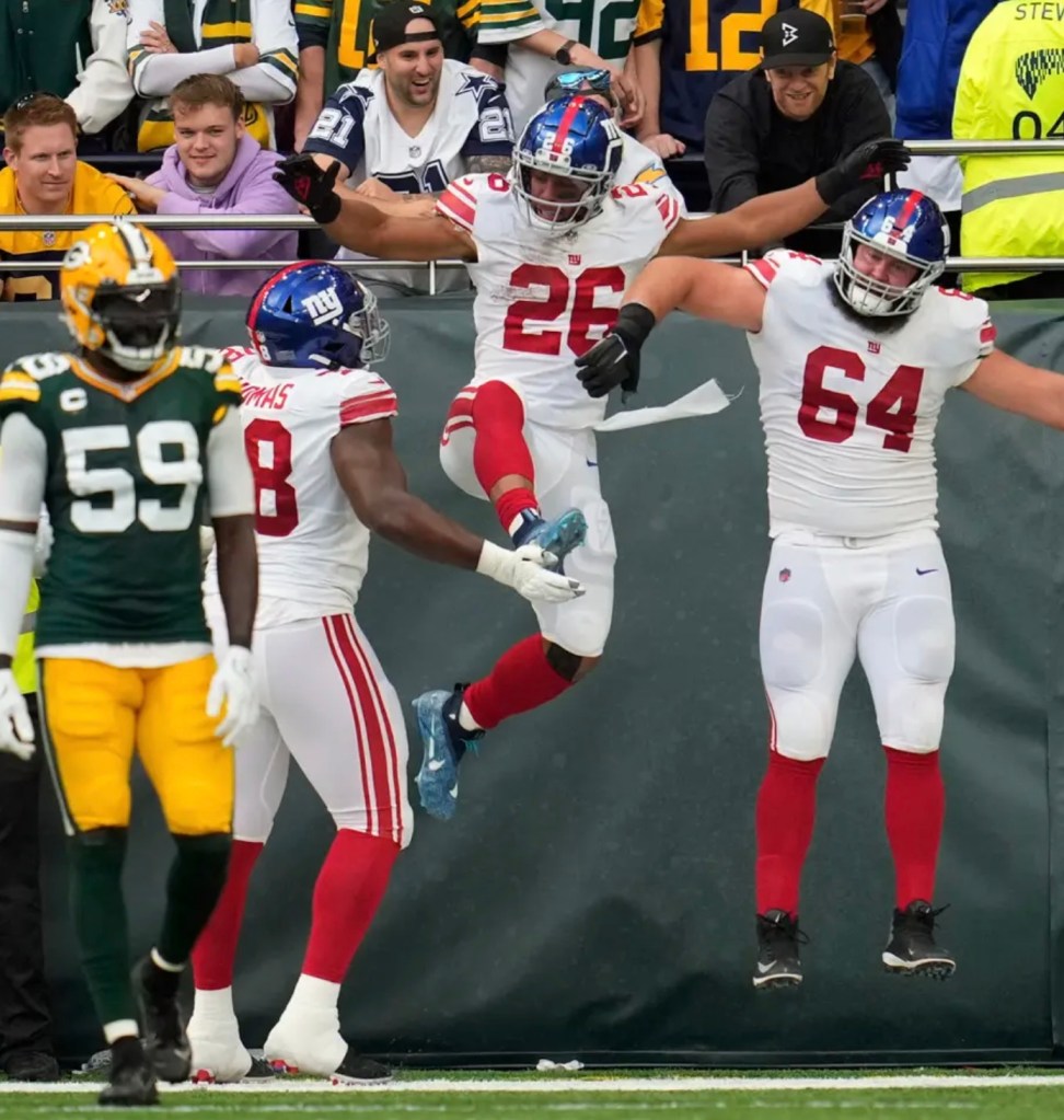 Barkley scored the game-winning touchdown with 6:08 remaining and then turned the game over to their largely no-name defense. Rodgers moved the Packers to the Giants’ 7 yard line but on fourth down his pass was deflected up and into the air by blitzing safety Xavier McKinney. The ball fell harmlessly to the grass at Tottenham Hotspur Stadium with 1:11 remaining and soon after the Giants secured an improbable 27-22 comeback victory.